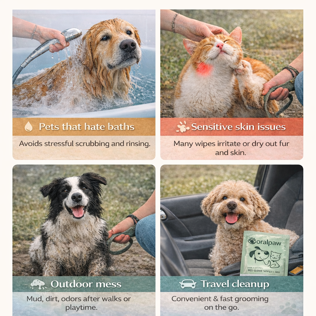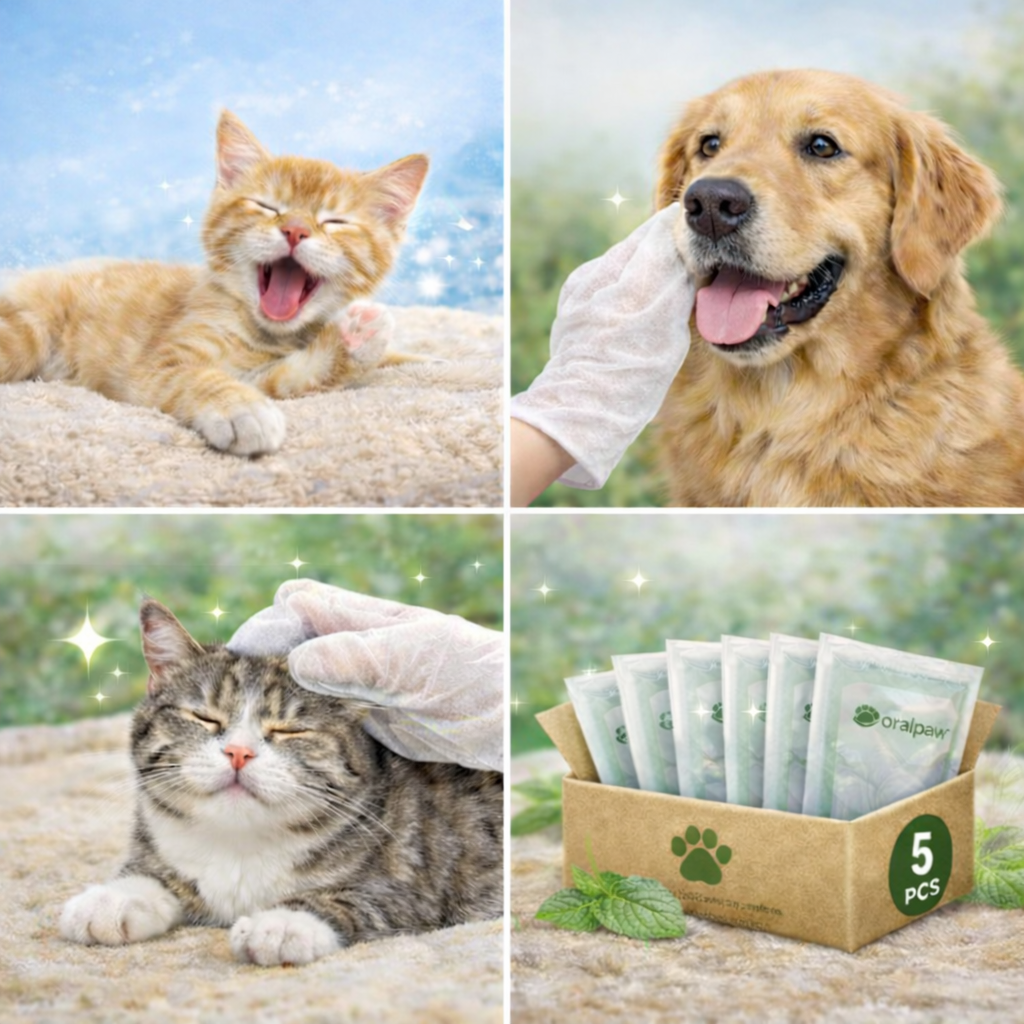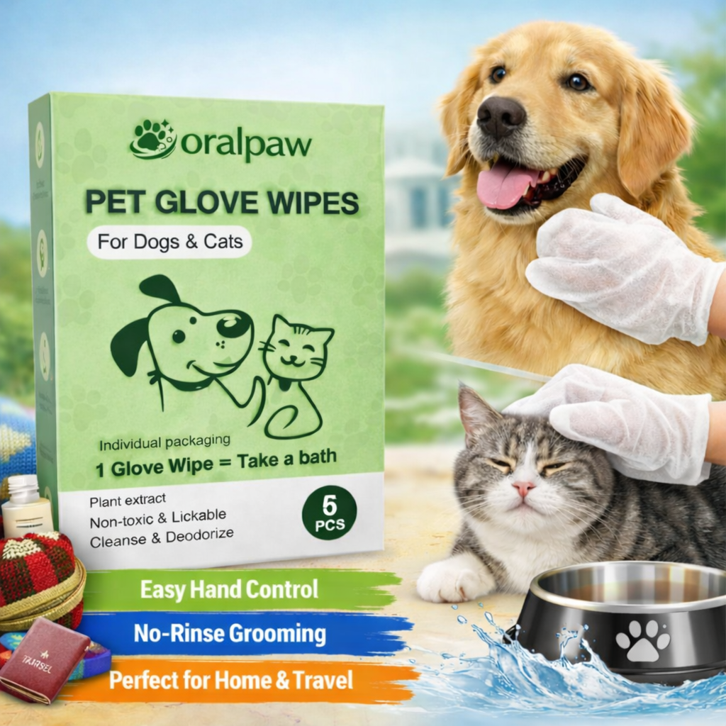 OralPaw™ Pet Glove Wipes are disposable, no‑rinse grooming wipes shaped like gloves for easy hand control. They gently clean, deodorize, and refresh your cat or dog — perfect for daily care, travel, or between bathtime touch‑ups.